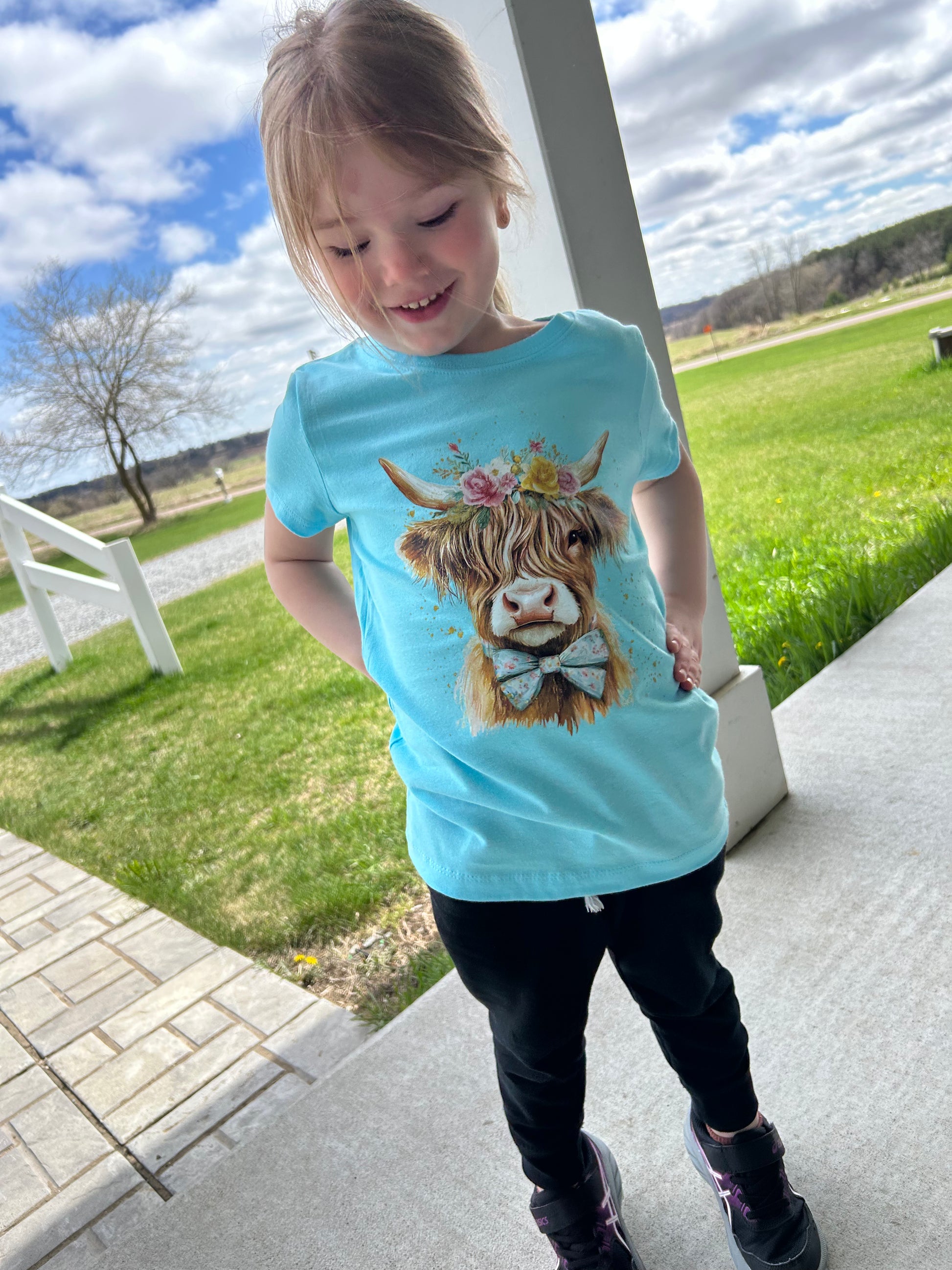 Highlander Cow w/ Floral Crown + Bow Tie -Short Sleeve Youth GIRLS